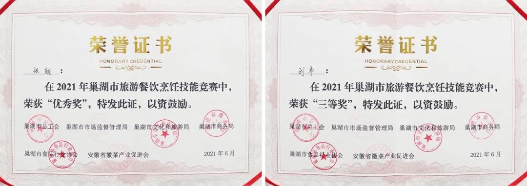 巢湖半島酒店喜獲“2021年巢湖市旅游餐飲烹飪技能競賽”兩項榮譽