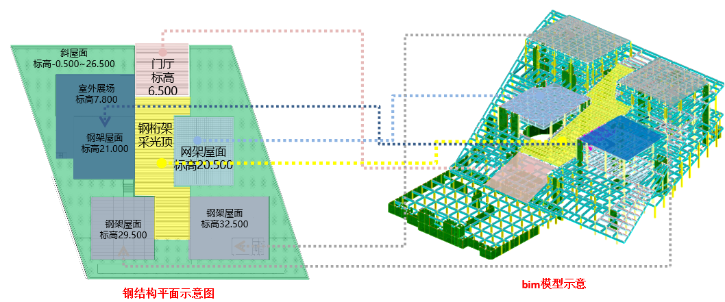 該項目主體采用現澆鋼筋混凝土框架-剪力墻結構體系,局部主體為鋼結構。其中,地下勁性鋼柱、地上勁性鋼柱、鋼骨梁、展廳區域為大跨度鋼結構;樓蓋、采光頂為方管桁架、入口門廳為圓管柱及箱型鋼梁支撐體系;屋頂為鋼架,天象廳屋蓋為焊接球網架結構,鋼構件形式多樣。項目的安裝方式為塔吊安裝,將充分證實公司的綜合能力。