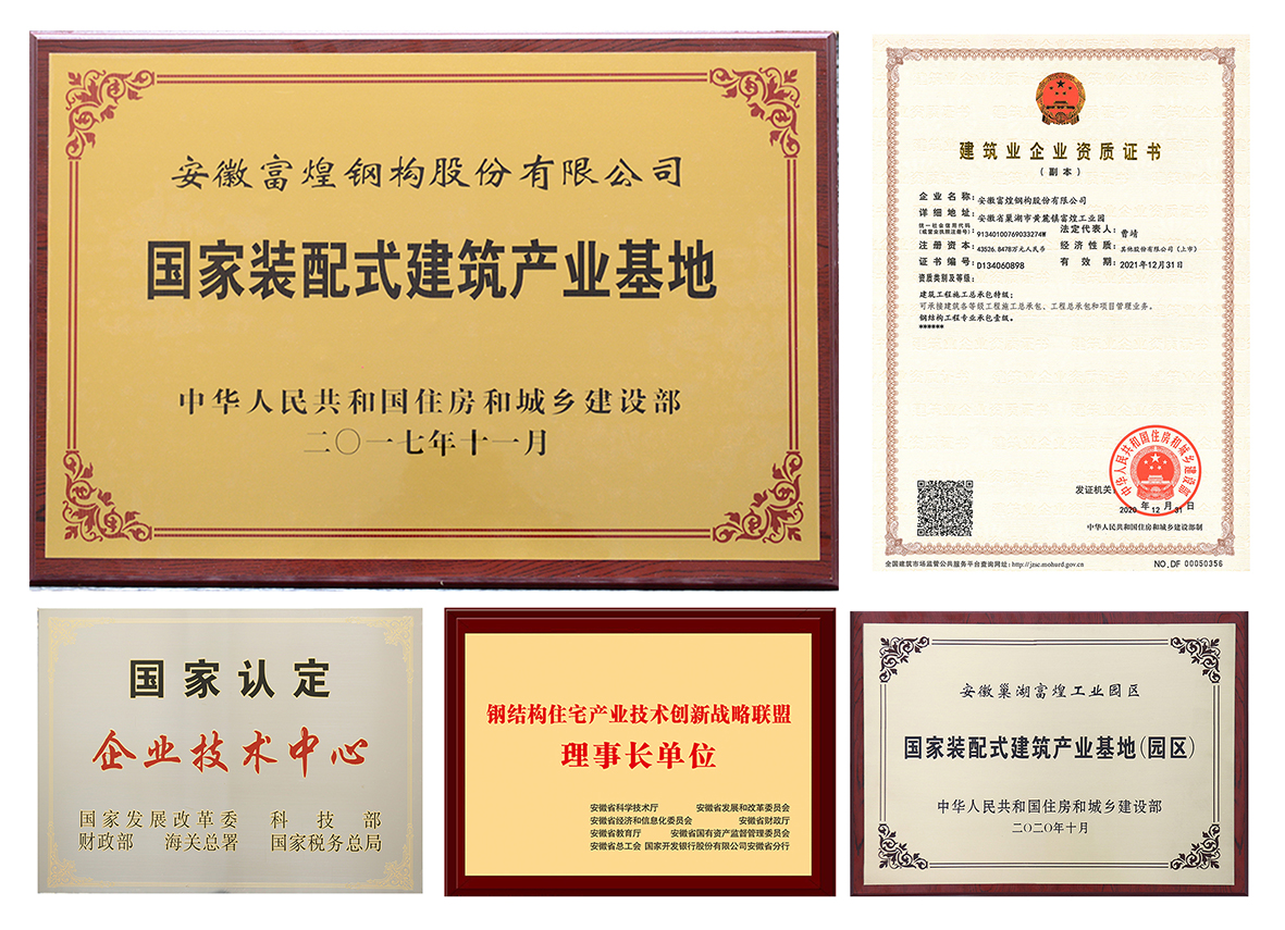 作為安徽進軍建筑產業化的先鋒企業,富煌鋼構早在2008年就被認定為“國家高新技術企業”;2014年獲批“國家認定企業技術中心”;2016年取得“安徽省建筑產業現代化示范基地”稱號;2017年3月榮獲“建筑工程施工總承包特級”資質;2017年11月被住建部評為首批“國家裝配式建筑產業基地”;2018年當選“國家裝配式鋼結構建筑技術創新聯盟”理事長單位;2020年入選“安徽省首批省級裝配式建筑產業基地”稱號、牽頭編制的《合肥市裝配式建筑應用技術系列手冊》正式發布、所在的富煌工業園被住建部認定為“國家裝配式建筑產業基地(園區)”。