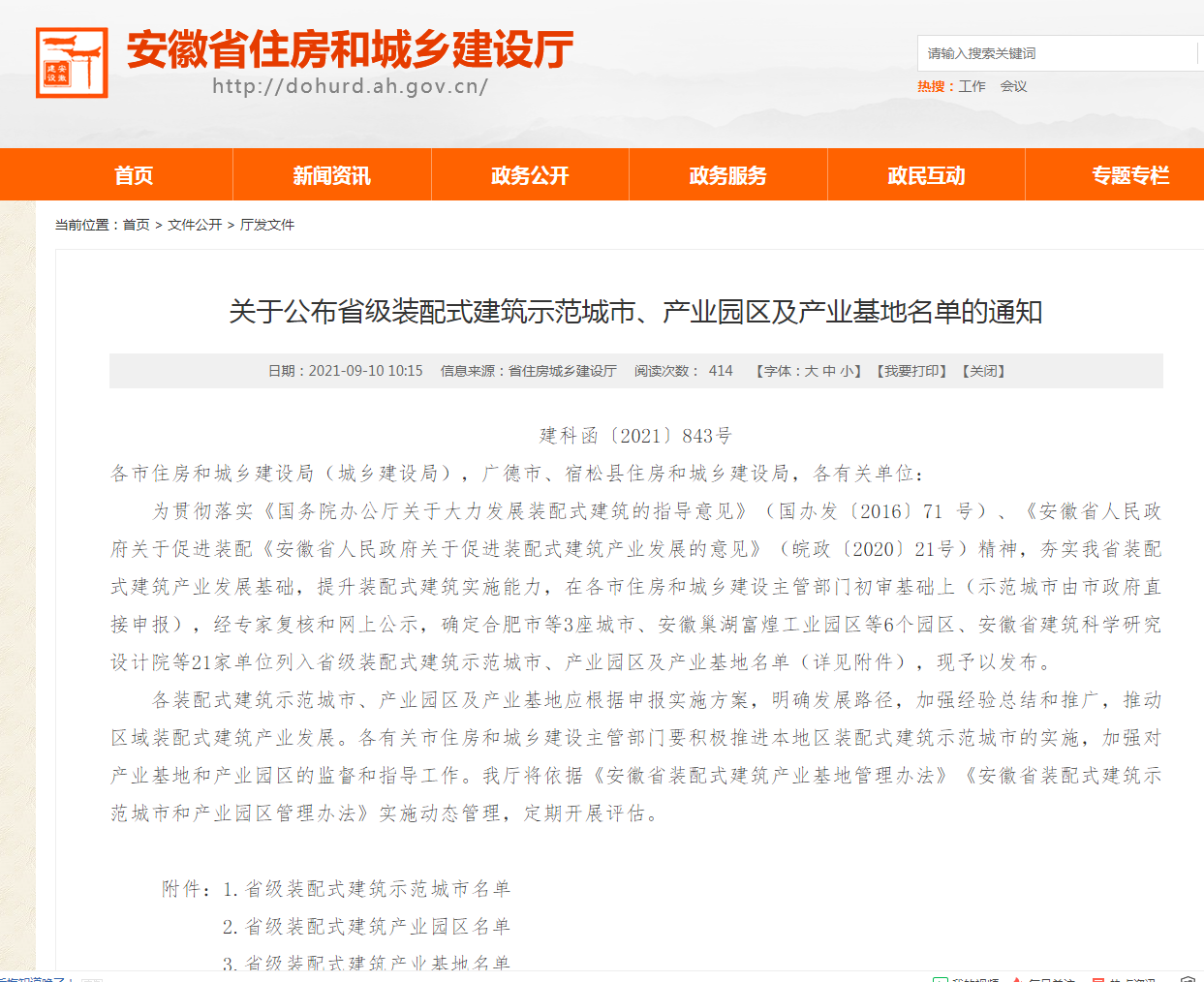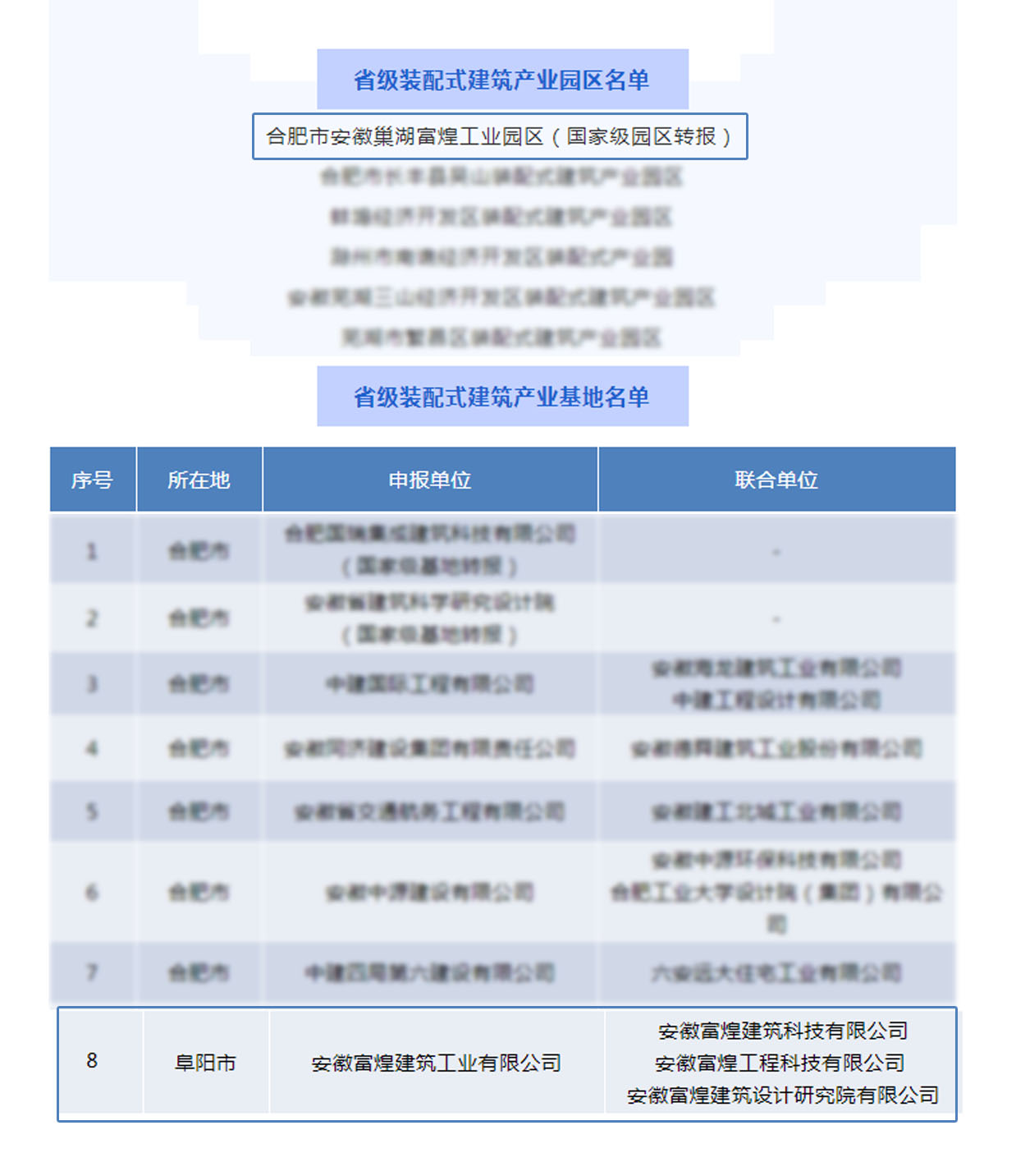 9月10日,安徽省住房和城鄉建設廳公布了省級裝配式建筑示范城市、產業園區及產業基地的名單,安徽富煌鋼構股份有限公司所在的富煌工業園成功入選省級裝配式建筑產業園區名單,旗下的安徽富煌建筑科技有限公司、安徽富煌工程科技有限公司、安徽富煌建筑設計研究有限公司成功入選省級裝配式建筑產業基地名單,此次全省僅有6個園區、21家單位被安徽省住建廳授予省級裝配式建筑產業園區和省級裝配式建筑產業基地稱號。