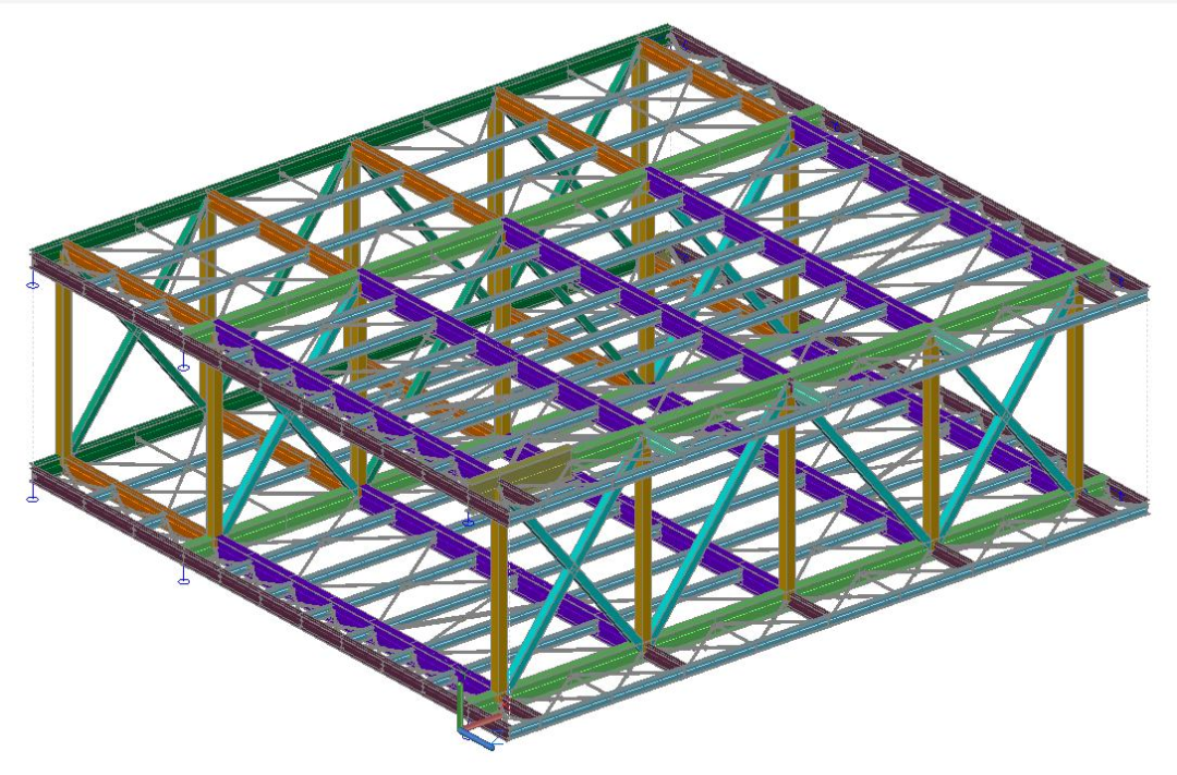 預制構件主要包括預制鋼梁、鋼柱、鋼桁架、桁架鋼筋樓承板等。項目地下部分為型鋼混凝土組合結構,地上部分為裝配式鋼結構,其中A塔樓為鋼框架-中心支撐結構,結構抗震等級為三級,其中鋼柱為二級;B塔樓為鋼框架結構,結構抗震等級為三級,其中鋼柱為二級;裙樓為鋼框架結構,抗震等級為三級。A、B塔樓均采用矩形鋼管混凝土柱,裙房采用矩形鋼管柱,鋼梁均為焊接H型鋼。連廊部分為鋼桁架結構,其中柱、斜腹桿為矩形鋼管,主梁為焊接H型鋼,樓板采用鋼筋桁架樓承板。連廊為整體桁架式無柱跨層大空間,空間尺度達到30mx28mx9.6m(H),為工廠分段預制,工業化程度極高。