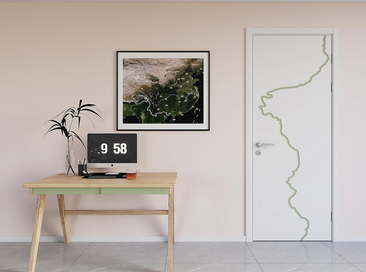 該作品設計靈感來源于長江——長江發源于青藏高原,滋養著中華兒女,如同一扇門守衛著一個家庭。王德浩把長江的文化內涵融入到木門的極簡風格中,用基礎型的平板銑型門做套色設計,將長江主流線形狀,放入白色霧面啞光的平板門中,蜿蜒躍動著,墨綠色流動的線條與白色的筆直正形成對比,采用墨綠色也契合了當下青山綠水就是金山銀山的環保理念。