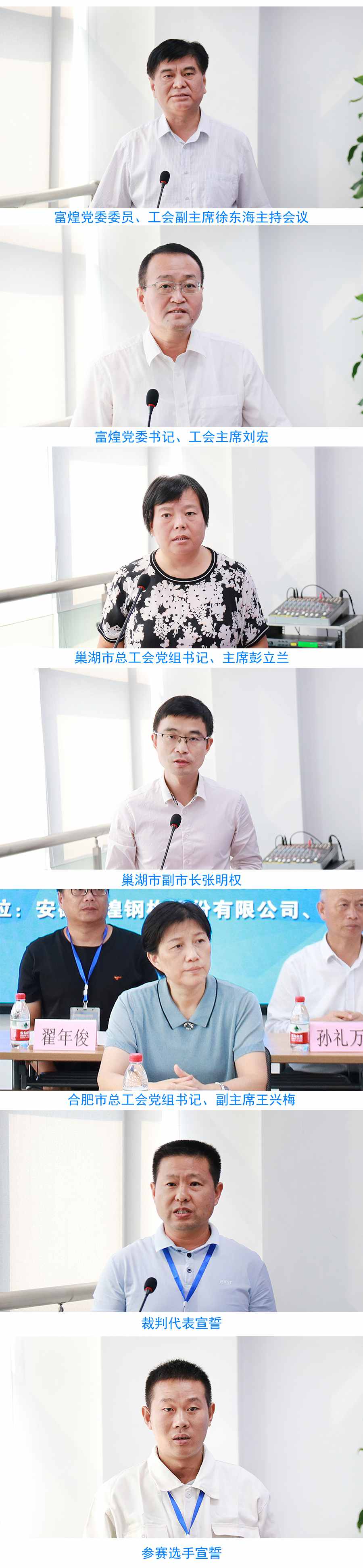 有關領導,裁判員,各代表隊領隊、選手近百人出席了競賽開幕式。開幕式上,合肥市總工會黨組書記、副主席王興梅,巢湖市副市長張明權,巢湖市總工會黨組書記、主席彭立蘭,富煌黨委書記、工會主席劉宏分別為本次競賽開幕式致辭。裁判員、選手代表在開幕式上分別宣誓。合肥市總工會黨組成員、副主席葛甫瑜,合肥市總工會勞動和經濟工作部部長崔莉,巢湖市黃麓鎮黨委副書記、工會聯合會主席翟年俊應邀出席本次競賽開幕式。開幕式由富煌黨委委員、工會副主席徐東海主持。
