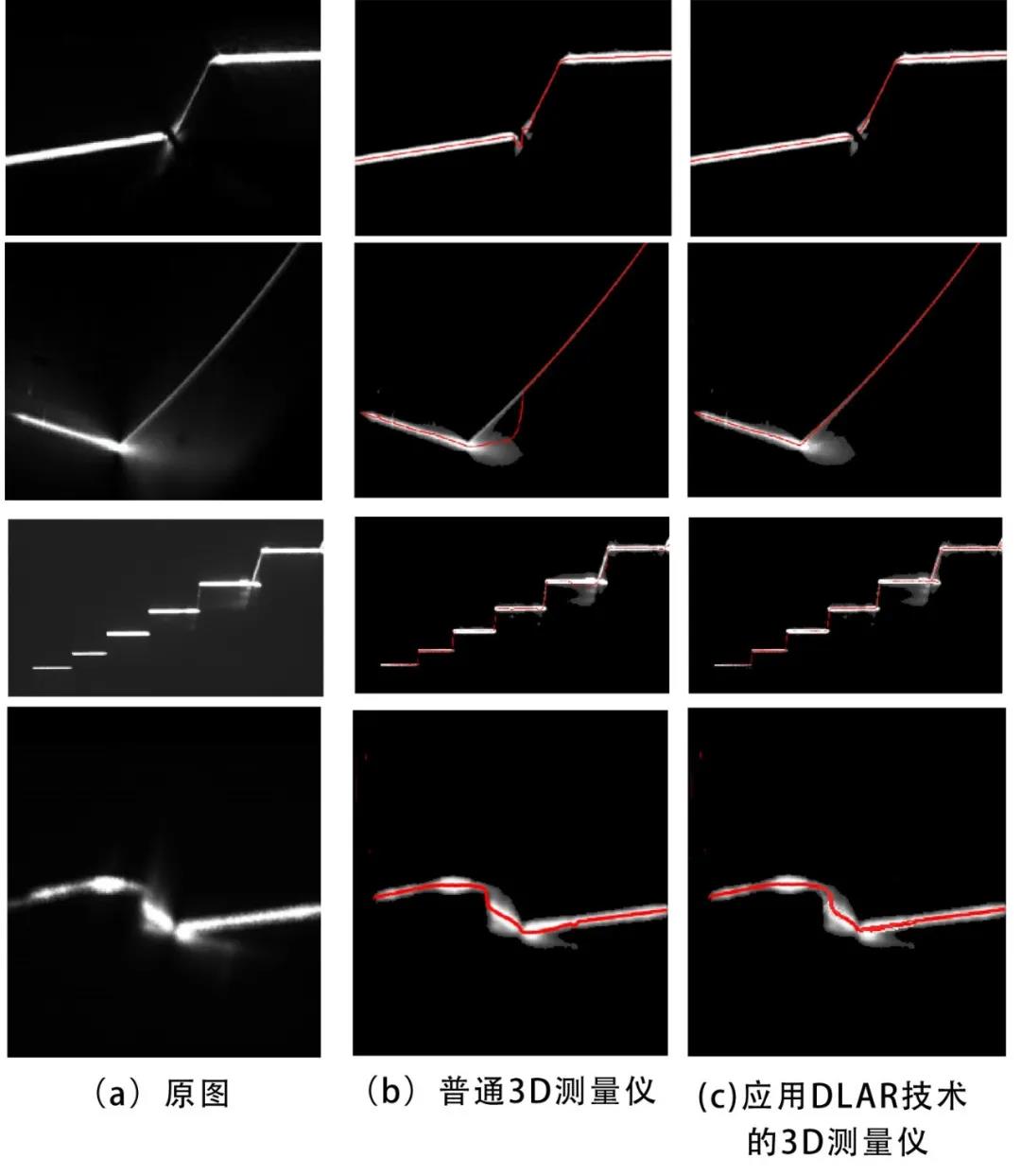 DLAR采用深度學習智能算法,有效地將三維激光測量圖像中的反光區域和激光條紋區域進行分離,減少了圖像中反光區域對中心線提取的干擾,提高了三維激光測量圖像中心線的提取精度。這種智能識別算法,可適用于不同場景,其魯棒性遠勝于動態閾值法、偏振法等業內常用方法。