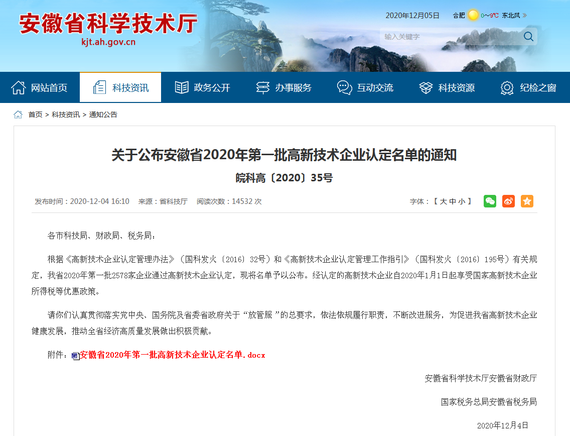 日前,安徽省科技廳、國稅局等部門聯合認定并公布了2020年第一批通過認定的高新技術企業,富煌集團旗下五家企業獲得高新技術企業認定。